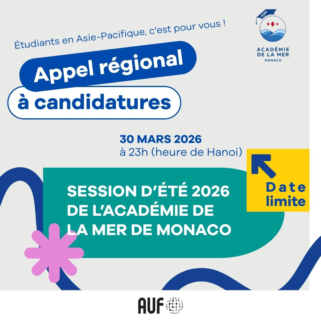 Appel régional à candidatures : session d’été 2026 de l’Académie de la Mer de MonacoUne opportunité à ne pas manquer pour les étudiants en Asie-Pacifique ! Dans le cadre de l’appel régional à candidatures pour la session d’été 2025 de l’Académie de la Mer de Monaco, deux excellents candidats francophones en Asie-Pacifique ont été sélectionnés. Fort de ce succès, l’AUF – Asie-Pacifique lance un nouvel appel régional à candidatures pour la session d’été 2026 de l’Académie de la Mer de Monaco, qui se déroulera du 29 juin au 11 juillet 2026. Cet appel vise à sélectionner deux lauréats qui auront l’opportunité de suivre une formation de haut niveau, reconnue pour sa richesse académique et la diversité de ses approches. Les candidats intéressés par cet appel sont invités à participer à un webinaire au début de mars, pour un partage d’expérience avec les deux lauréats de la promotion 2025, afin de mieux découvrir les atouts et les opportunités exceptionnelles offerts par cette expérience unique.Pour plus d’informations et pour déposer votre candidature : https://tinyurl.com/5czyyszj