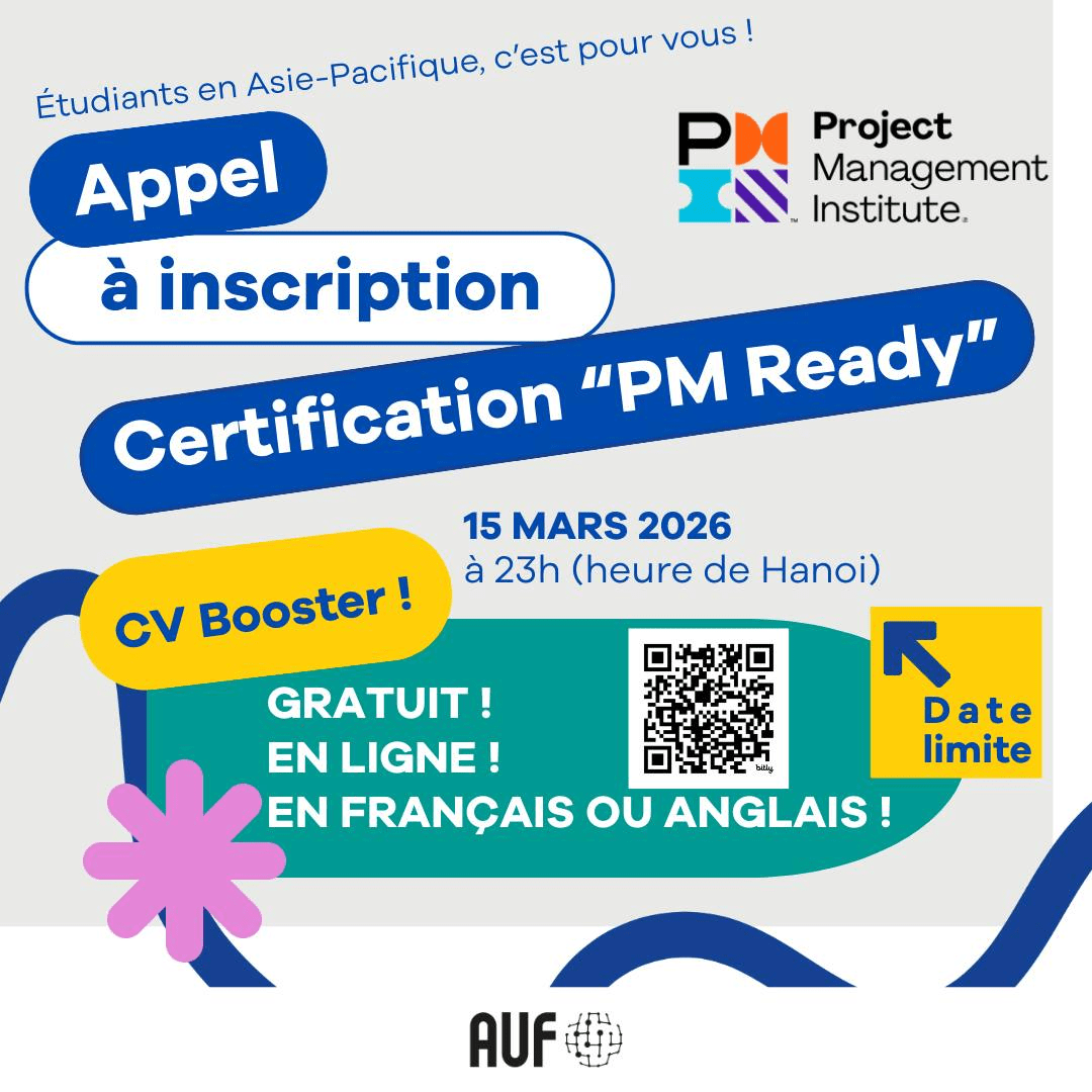 L'Agence Universitaire de la Francophonie (AUF) vous offre GRATUITEMENT la formation + l'examen pour la certification PMI Project Management Ready, en français ou en anglais !
