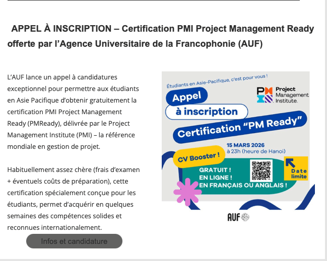 📧 La lettre d’information de l’AUF - Asie-Pacifique pour le mois de février 2026 est disponible !📍 Cliquez sur bit.ly/4bywAnw pour la consulter.