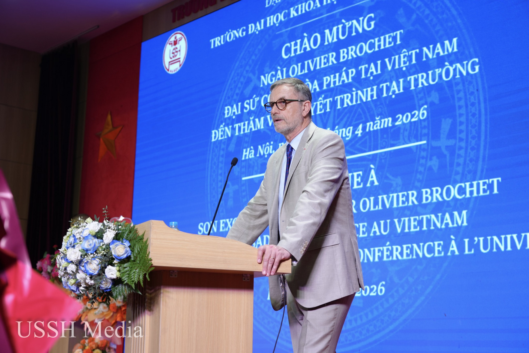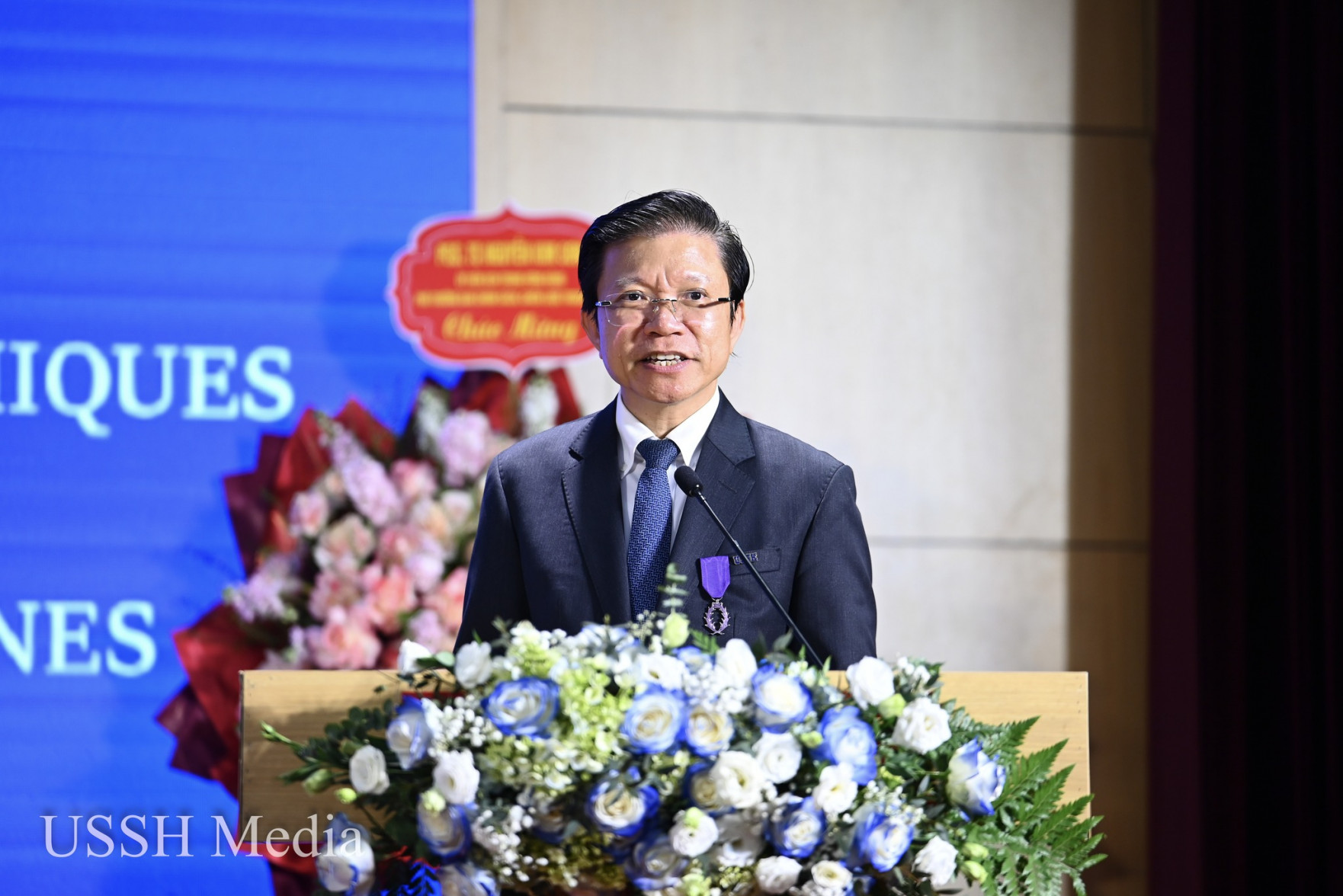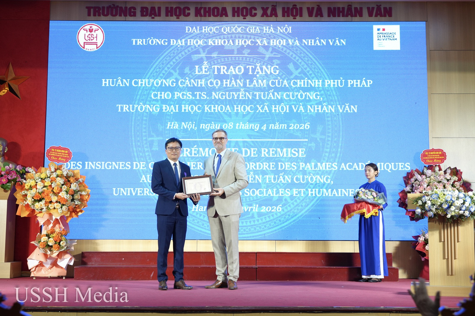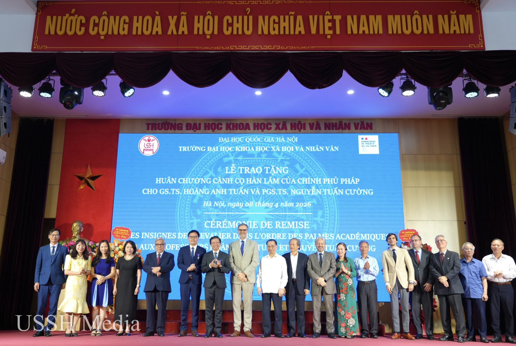 🏅 Le 8 avril 2026, l'Ambassadeur de France au Vietnam, M. Olivier Brochet, a remis l'insigne des Palmes académiques à deux éminents chercheurs vietnamiens : le Prof. Hoang Anh Tuan, Recteur de l'@Université des Sciences sociales et humaines de Hanoï (USSH), et le Pr. associé Nguyen Tuan Cuong, Directeur de l'@Institut Han-Nôm.