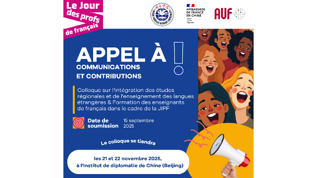 Pour célébrer la 7e édition de la Journée mondiale des professeurs de français, favoriser les échanges et les inspirations mutuelles entre les civilisations chinoise et française, et consolider les fruits du 60e anniversaire des relations diplomatiques sino-françaises, l'Institut de Diplomatie de Chine (CFAU) organisera, en partenariat avec l'Ambassade de France en Chine et l'Agence universitaire de la Francophonie (AUF), un colloque sur « L'intégration des études régionales et de l'enseignement des langues étrangères » ainsi qu'une formation thématique pour la Journée mondiale des professeurs de français 2025. Ces évènements sont prévus pour les 21 et 22 novembre 2025 sur le campus Zhanlanguan de CFAU (Beijing).